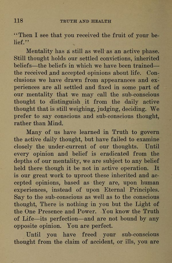 Many of us have learned in Truth to govern the active daily thought, but have failed to examine closely the under-current of our thoughts. Until every opinion and belief is eradicated from the depths of our mentality, we are subject to any belief held there though it be not in active operation. It is our great work to uproot these inherited and accepted opinions, based as they are, upon human experiences, instead of upon Eternal Principles. Say to the sub-conscious as well as to the conscious thought, There is nothing in you but the Light of the One Presence and Power. You know the Truth of Life --- its perfection --- and are not bound by any opposite opinion. You are perfect.