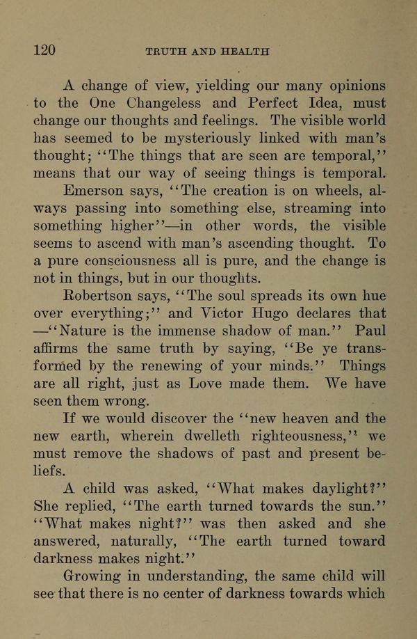 Robertson says, "The soul spreads its own hue over everything;" and Victor Hugo declares that --- "Nature is the immense shadow of man." Paul affirms the same truth by saying, "Be ye transformed by the renewing of your minds." Things are all right, just as Love made them. We have seen them wrong.