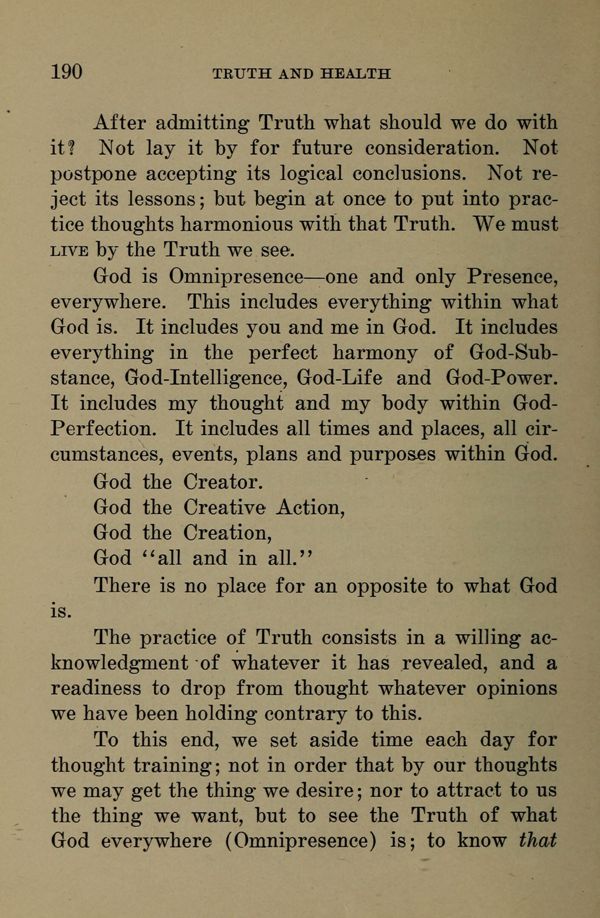 The practice of Truth consists in a willing acknowledgment of whatever it has revealed, and a readiness to drop from thought whatever opinions we have been holding contrary to this. To this end, we set aside time each day for thought training; not in order that by our thoughts we may get the thing we desire; nor to attract to us the thing we want, but to see the Truth of what God everywhere (Omnipresence) is to know that