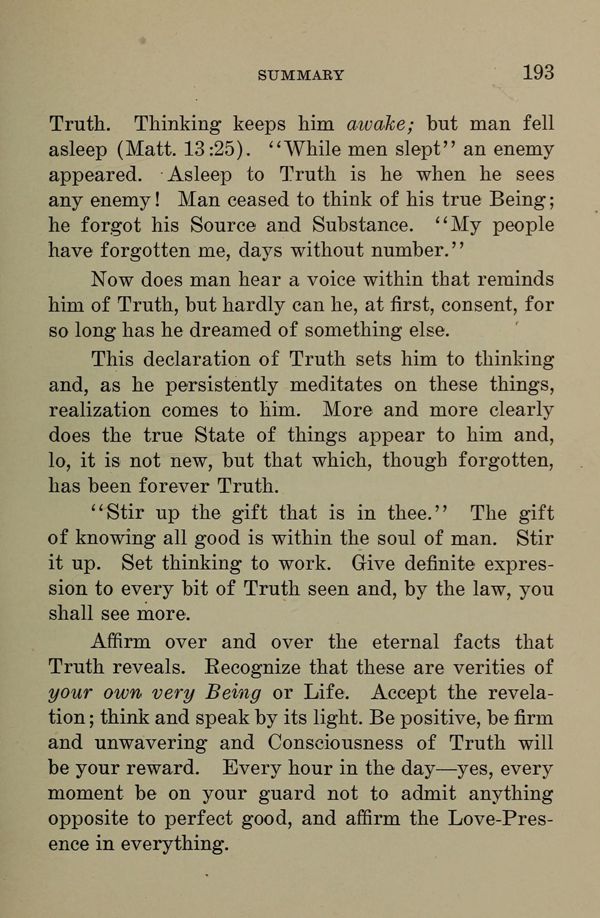 Truth. Thinking keeps him awake; but man fell asleep (Matt. 13:25). "While men slept" an enemy appeared. Asleep to Truth is he when he sees any enemy! Man ceased to think of his true Being; he forgot his Source and Substance. "My people have forgotten me, days without number."