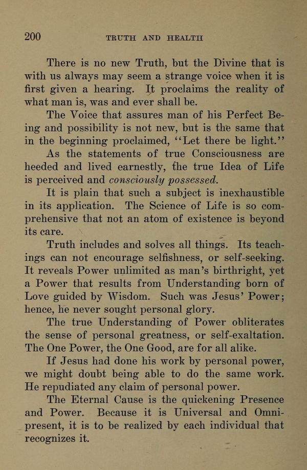 The Voice that assures man of his Perfect Being and possibility is not new, but is the same that in the beginning proclaimed, "Let there be light." As the statements of true Consciousness are heeded and lived earnestly, the true Idea of Life is perceived and consciously possessed.