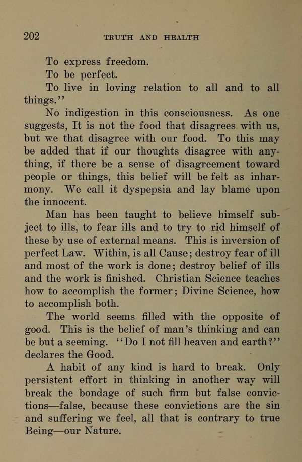 No indigestion in this consciousness. As one suggests, It is not the food that disagrees with us, but we that disagree with our food. To this may be added that if our thoughts disagree with anything, if there be a. sense of disagreement toward people or things, this belief will be felt as inharmony. We call it dyspepsia and lay blame upon the innocent.