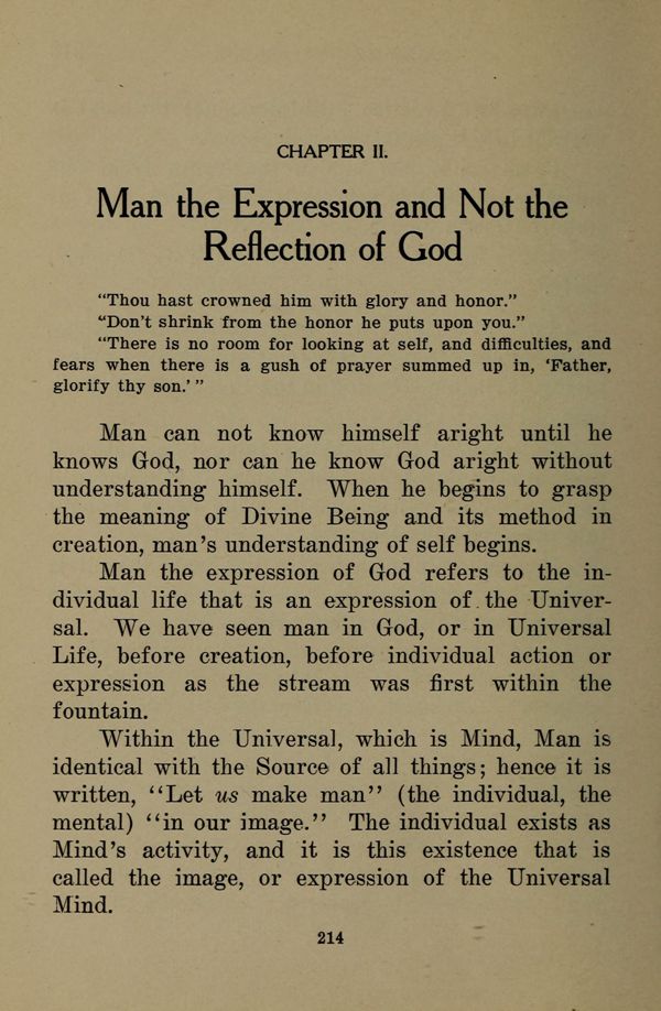 Man the expression of God refers to the individual life that is an expression of. the Universal. We have seen man in God, or in Universal Life, before creation, before individual action or expression as the stream was first within the fountain.
