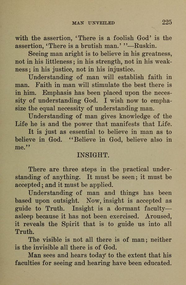 Understanding of man and things has been based upon outsight. Now, insight is accepted as guide to Truth. Insight is a dormant faculty asleep because it has not been exercised. Aroused, it reveals the Spirit that is to guide us into all Truth.