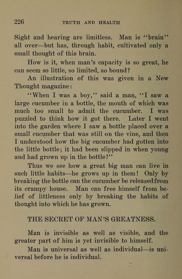 Thus we see how a great big man can live in such little habits --- he grows up in them! Only by breaking the bottle can the cucumber be released from its crampy house. Man can free himself from belief of littleness only by breaking the habits of thought into which he has grown.