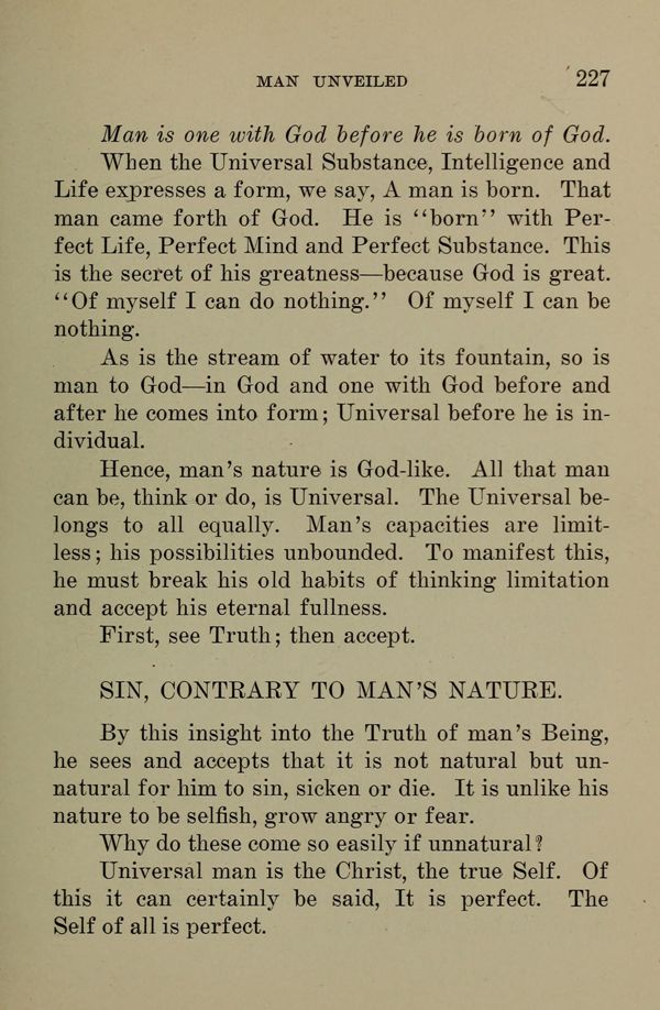 By this insight into the Truth of man's Being, he sees and accepts that it is not natural but unnatural for him to sin, sicken or die. It is unlike his nature to be selfish, grow angry or fear.