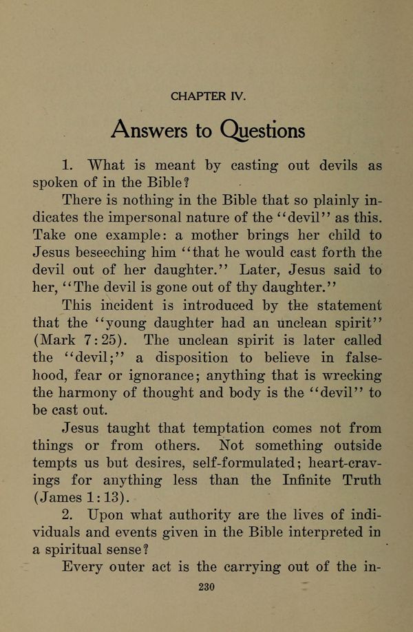 There is nothing in the Bible that so plainly indicates the impersonal nature of the "devil" as this. Take one example: a mother brings her child to Jesus beseeching him "that he would cast forth the devil out of her daughter." Later, Jesus said to her, "The devil is gone out of thy daughter."