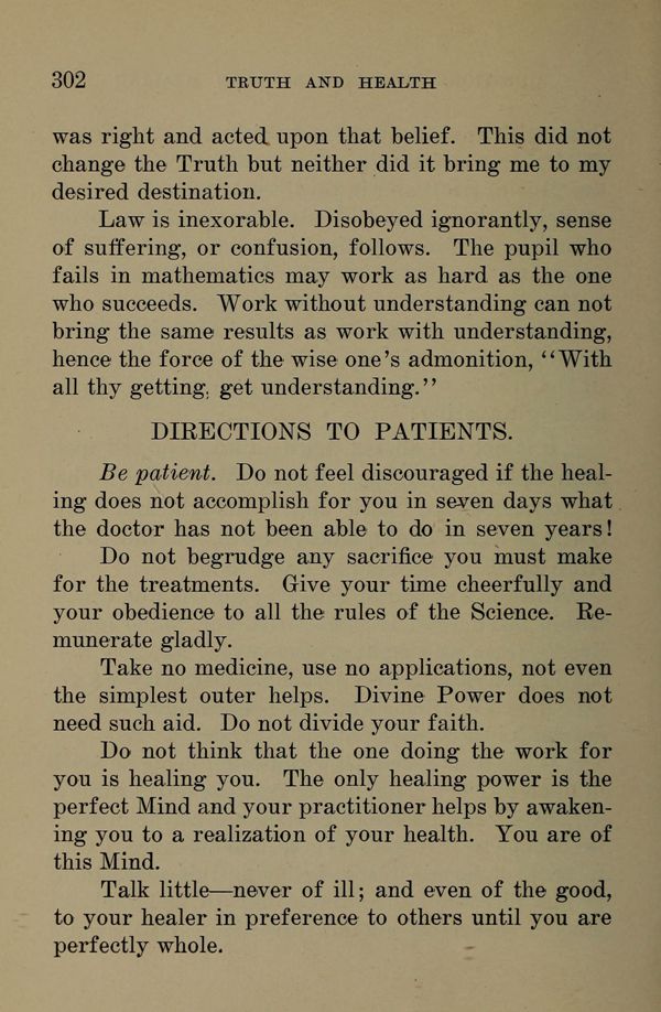 Be patient. Do not feel discouraged if the healing does not accomplish for you in seven days what the doctor has not been able to do in seven years! Do not begrudge any sacrifice, you must make for the treatments. Give your time cheerfully and your obedience to all the rules of the Science. Remunerate gladly.