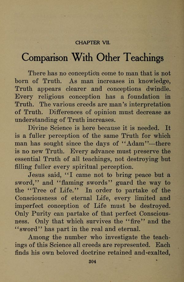 Divine Science is here because it is needed. It is a fuller perception of the same Truth for which man has sought since the days of "Adam" --- there is no new Truth. Every advance must preserve the essential Truth of all teachings, not destroying but filling fuller every spiritual perception.