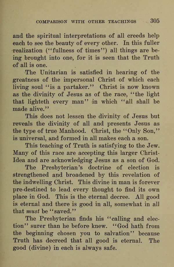 The Presbyterian's doctrine of election is strengthened and broadened by this revelation of the indwelling Christ. This divine in man is forever pre-destined to lead every thought to find its own place in God. This is the eternal decree. All good is eternal and there is good in all, somewhat in all that must be "saved."