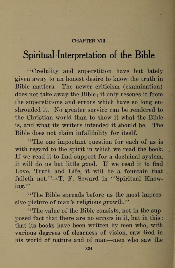 "The one important question for each of us is with regard to the spirit in which we read the book. If we read it to find support for a doctrinal system, it will do us but little good. If we read it to find Love, Truth and Life, it will be a fountain that faileth not." --- T. F. Seward in "Spiritual Knowing." "The Bible spreads before us the most impressive picture of man's religious growth."