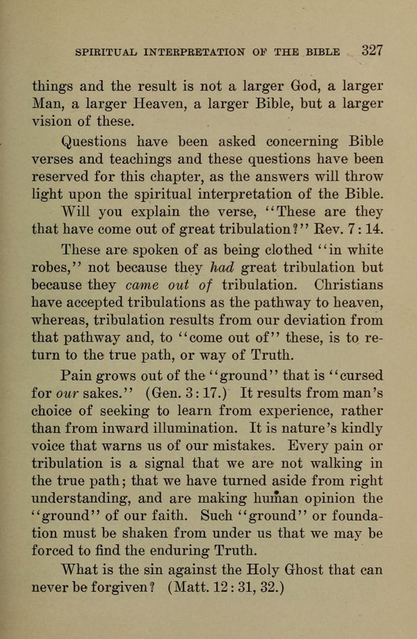 Questions have been asked concerning Bible verses and teachings and these questions have been reserved for this chapter, as the answers will throw light upon the spiritual interpretation of the Bible.