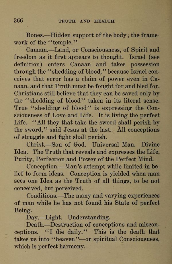 Canaan. --- Land, or Consciousness, of Spirit and freedom as it first appears to thought. Israel (see definition) enters Canaan and takes possession through the "shedding of blood," because Israel conceives that error has a claim of power even in Canaan, and that Truth must be fought for and bled for. Christians still believe that they can be saved only by the " shedding of blood" taken in its literal sense. True "shedding of blood" is expressing the Consciousness of Love and Life. It is living the perfect Life. "All they that take the sword shall perish by the sword," said Jesus at the last. All conceptions of struggle and fight shall perish.