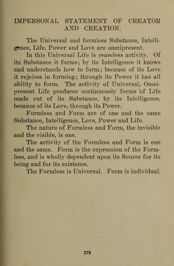 The Universal and formless Substance, Intelligence, Life, Power and Love are omnipresent.