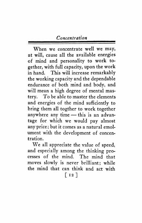 When we concentrate well we may, at will, cause all the available energies of mind and personality to work together, with full capacity, upon the work in hand. This will increase remarkably the working capacity and the dependable endurance of both mind and body, and will mean a high degree of mental mastery. To be able to master the elements and energies of the mind sufficiently to bring them all together to work together anywhere any time • -- this is an advantage for which we would pay almost any price; but it comes as a natural emolument with the development of concentration.
