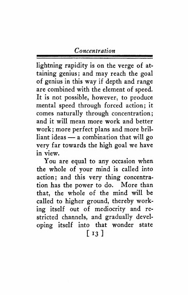 lightning rapidity is on the verge of attaining genius; and may reach the goal of genius in this way if depth and range are combined with the element of speed. It is not possible, however, to produce mental speed through forced action; it comes naturally through concentration; and it will mean more work and better work; more perfect plans and more brilliant ideas -- a combination that will go very far towards the high goal we have in view.