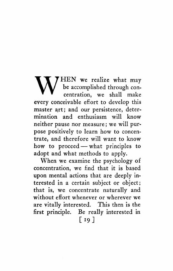 WHEN we realize what may be accomplished through concentration, we shall make every conceivable effort to develop this master art; and our persistence, determination and enthusiasm will know neither pause nor measure; we will purpose positively to learn how to concentrate, and therefore will want to know how to proceed -- what principles to adopt and what methods to apply.