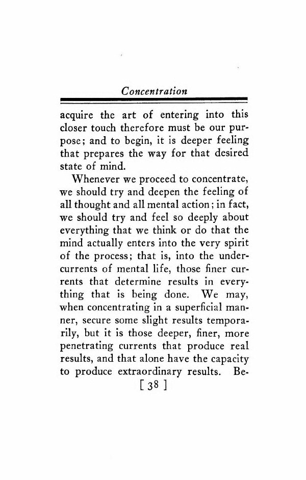 Whenever we proceed to concentrate, we should try and deepen the feeling of all thought and all mental action; in fact, we should try and feel so deeply about everything that we think or do that the mind actually enters into the very spirit of the process; that is, into the undercurrents of mental life, those finer currents that determine results in everything that is being done. We may, when concentrating in a superficial manner, secure some slight results temporarily, but it is those deeper, finer, more penetrating currents that produce real results, and that alone have the capacity to produce extraordinary results. Besides,