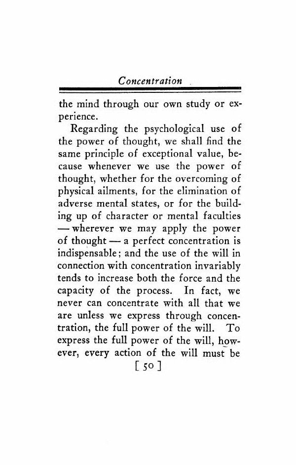 Regarding the psychological use of the power of thought, we shall find the same principle of exceptional value, because whenever we use the power of thought, whether for the overcoming of physical ailments, for the elimination of adverse mental states, or for the building up of character or mental faculties -- wherever we may apply the power of thought -- a perfect concentration is indispensable; and the use of the will in connection with concentration invariably tends to increase both the force and the capacity of the process. In fact, we never can concentrate with all that we are unless we express through concentration, the full power of the will. To express the full power of the will, however, every action of the will must be