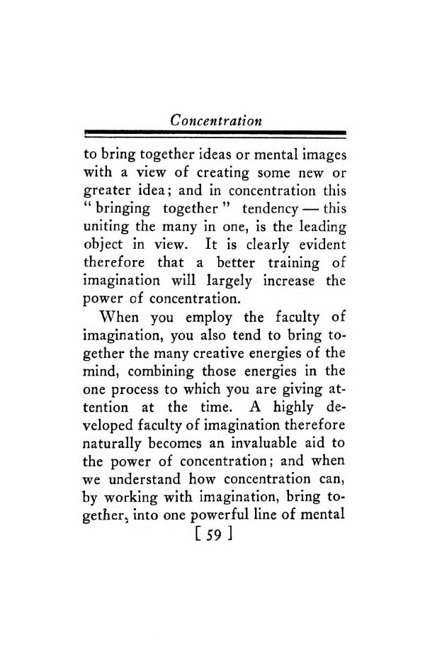 to bring together ideas or mental images with a view of creating some new or greater idea; and in concentration this "bringing together" tendency -- this uniting the many in one, is the leading object in view. It is clearly evident therefore that a better training of imagination will largely increase the power of concentration.