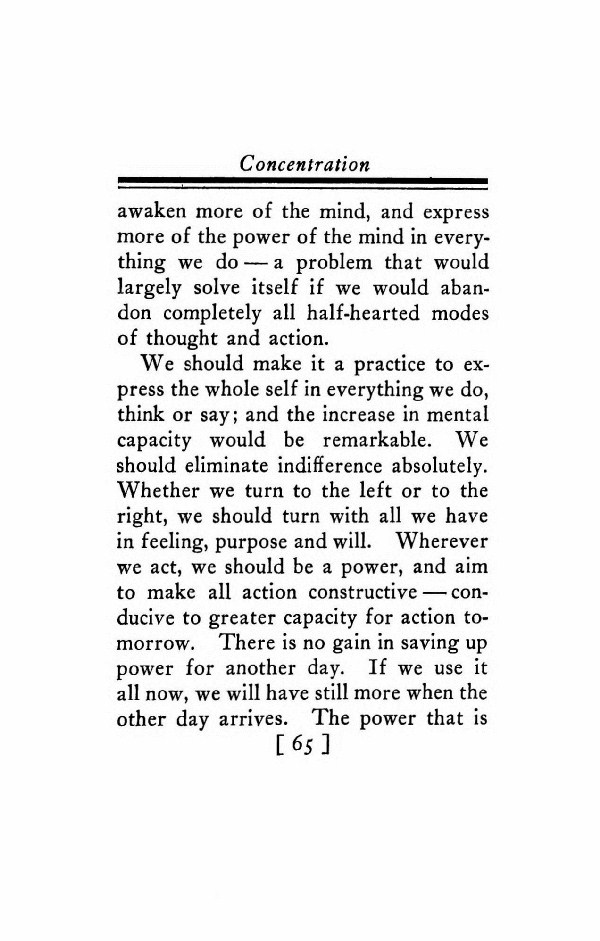 We should make it a practice to express the whole self in everything we do, think or say; and the increase in mental capacity would be remarkable. We should eliminate indifference absolutely. Whether we turn to the left or to the right, we should turn with all we have in feeling, purpose and will. Wherever we act, we should be a power, and aim to make all action constructive -- conducive to greater capacity for action tomorrow. There is no gain in saving up power for another day. If we use it all now, we will have still more when the other day arrives. The power that is