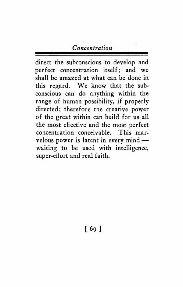 direct the subconscious to develop and perfect concentration itself; and we shall be amazed at what can be done in this regard. We know that the subconscious can do anything within the range of human possibility, if properly directed; therefore the creative power of the great within can build for us all the most effective and the most perfect concentration conceivable. This marvelous power is latent in every mind -- waiting to be used with intelligence, super-effort and real faith.