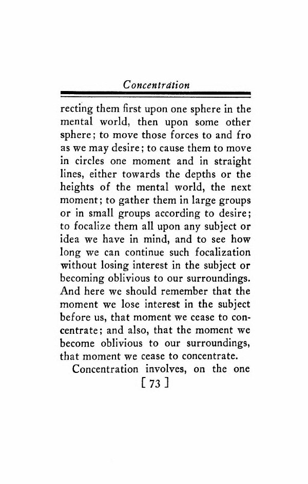 them first upon one sphere in the mental world, then upon some other sphere; to move those forces to and fro as we may desire; to cause them to move in circles one moment and in straight lines, either towards the depths or the heights of the mental world, the next moment; to gather them in large groups or in small groups according to desire; to focalize them all upon any subject or idea we have in mind, and to see how long we can continue such focalization without losing interest in the subject or becoming oblivious to our surroundings. And here we should remember that the moment we lose interest in the subject before us, that moment we cease to concentrate; and also, that the moment we become oblivious to our surroundings, that moment we cease to concentrate. Concentration involves, on the one