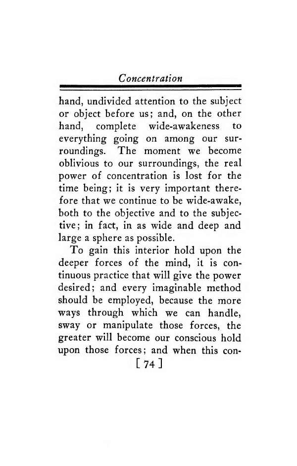 hand, undivided attention to the subject or object before us; and, on the other hand, complete wide-awakeness to everything going on among our surroundings. The moment we become oblivious to our surroundings, the real power of concentration is lost for the time being; it is very important therefore that we continue to be wide-awake, both to the objective and to the subjective; in fact, in as wide and deep and large a sphere as possible.
