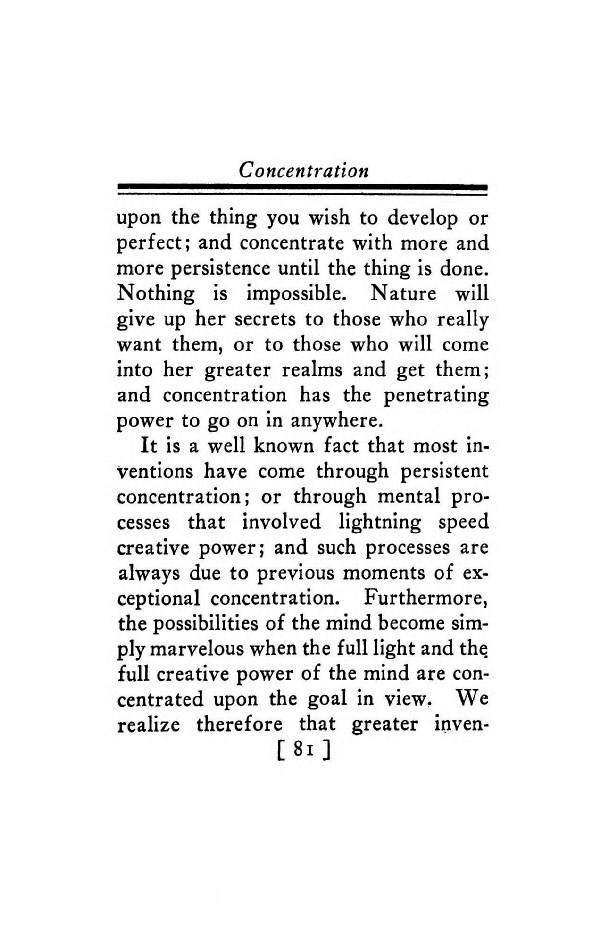 It is a well known fact that most inventions have come through persistent concentration; or through mental processes that involved lightning speed creative power; and such processes are always due to previous moments of exceptional concentration. Furthermore, the possibilities of the mind become simply marvelous when the full light and the full creative power of the mind are concentrated upon the goal in view. We realize therefore that greater inventions