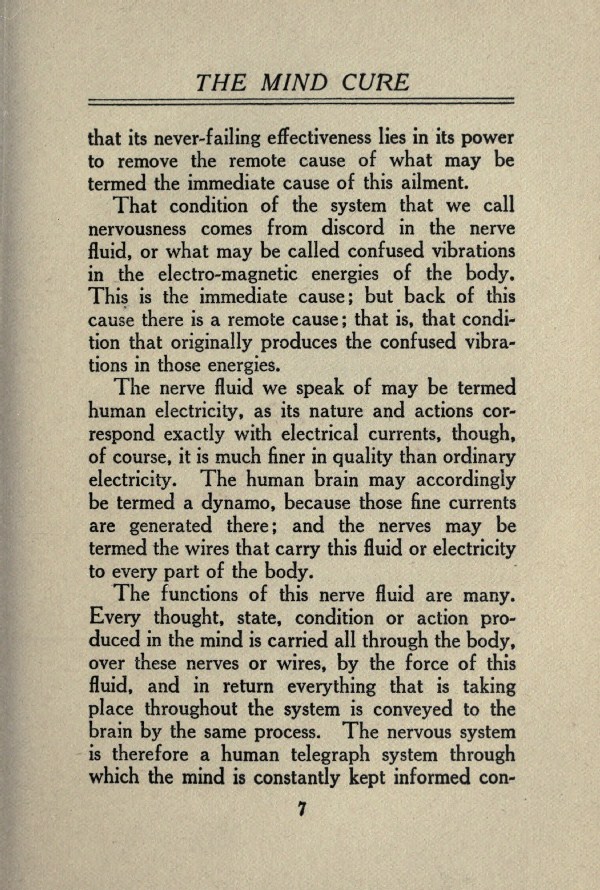 The nerve fluid we speak of may be termed human electricity, as its nature and actions correspond exactly with electrical currents, though, of course, it is much finer in quality than ordinary electricity. The human brain may accordingly be termed a dynamo, because those fine currents are generated there; and the nerves may be termed the wires that carry this fluid or electricity to every part of the body.