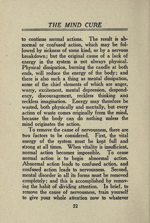 To remove the cause of nervousness, there are two factors to be considered. First, the vital energy of the system must be kept full and strong at all times. When vitality is insufficient, normal action becomes impossible. To cease normal action is to begin abnormal action. Abnormal action leads to confused action, and confused action leads to nervousness. Second, mental disorder in all its forms must be removed completely; and this is accomplished by removing the habit of dividing attention. In brief, to remove the cause of nervousness, train yourself to give your whole attention now to whatever