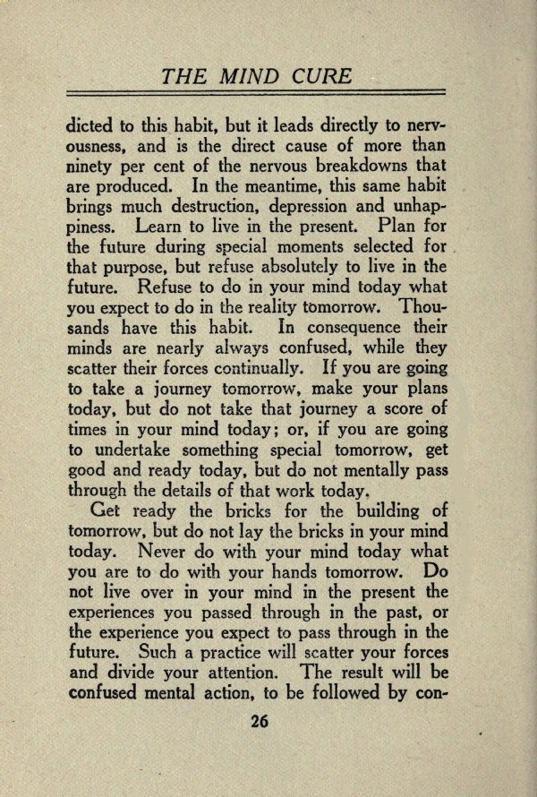 to this habit, but it leads directly to nervousness, and is the direct cause of more than ninety per cent of the nervous breakdowns that are produced. In the meantime, this same habit brings much destruction, depression and unhappiness. Learn to live in the present. Plan for the future during special moments selected for that purpose, but refuse absolutely to live in the future. Refuse to do in your mind today what you expect to do in the reality tomorrow. Thousands have this habit. In consequence their minds are nearly always confused, while they scatter their forces continually. If you are going to take a journey tomorrow, make your plans today, but do not take that journey a score of times in your mind today; or, if you are going to undertake something special tomorrow, get good and ready today, but do not mentally pass through the details of that work today.