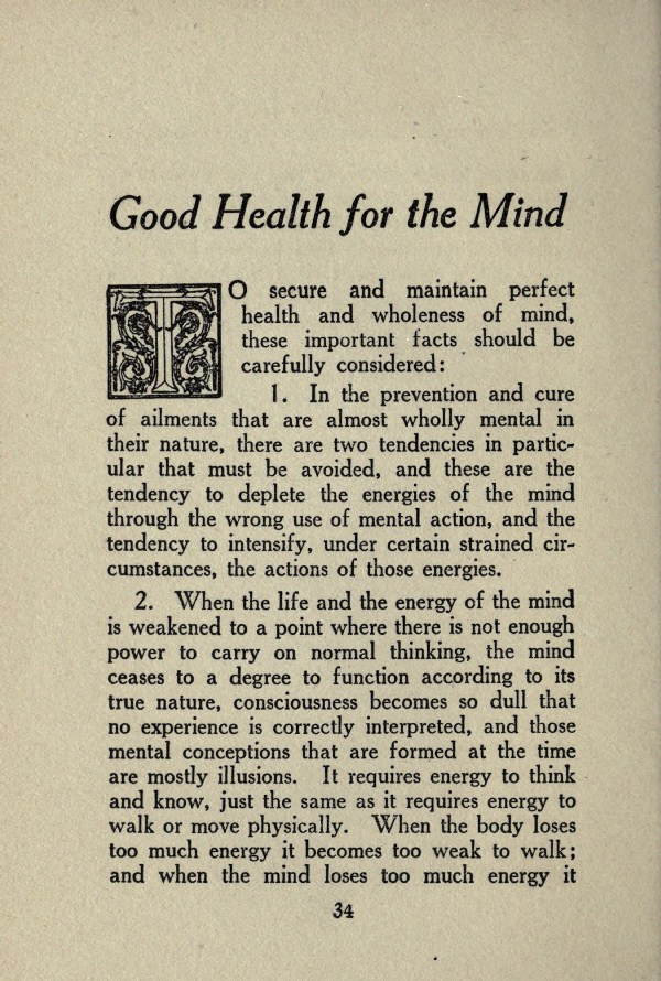 1 . In the prevention and cure of ailments that are almost wholly mental in their nature, there are two tendencies in particular that must be avoided, and these are the tendency to deplete the energies of the mind through the wrong use of mental action, and the tendency to intensify, under certain strained circumstances, the actions of those energies.