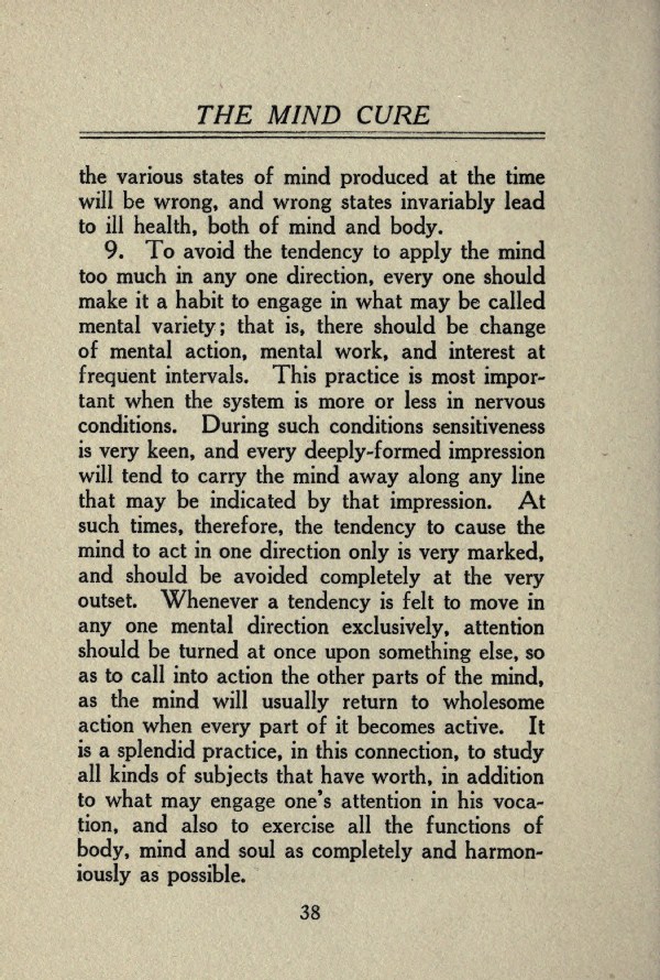 9. To avoid the tendency to apply the mind too much in any one direction, every one should make it a habit to engage in what may be called mental variety; that is, there should be change of mental action, mental work, and interest at frequent intervals. This practice is most important when the system is more or less in nervous conditions. During such conditions sensitiveness is very keen, and every deeply-formed impression will tend to carry the mind away along any line that may be indicated by that impression. At such times, therefore, the tendency to cause the mind to act in one direction only is very marked, and should be avoided completely at the very outset. Whenever a tendency is felt to move in any one mental direction exclusively, attention should be turned at once upon something else, so as to call into action the other parts of the mind, as the mind will usually return to wholesome action when every part of it becomes active. It is a splendid practice, in this connection, to study all kinds of subjects that have worth, in addition to what may engage one's attention in his vocation, and also to exercise all the functions of body, mind and soul as completely and harmoniously as possible.