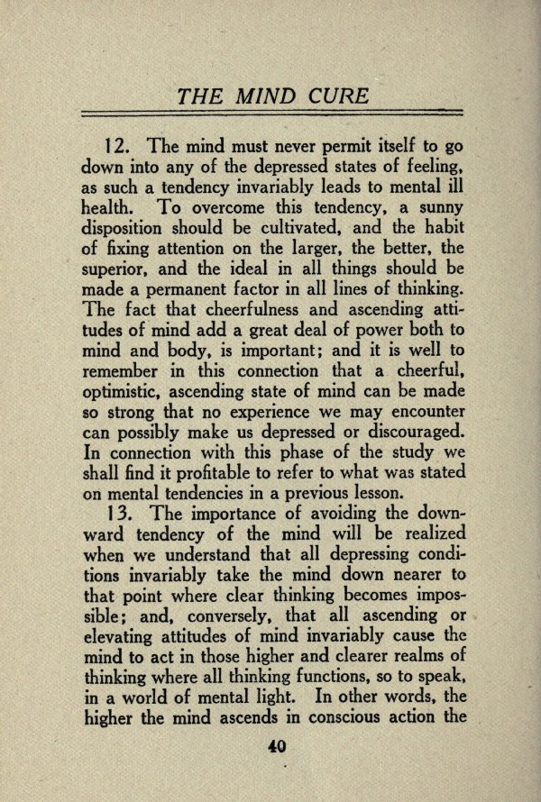 12. The mind must never permit itself to go down into any of the depressed states of feeling, as such a tendency invariably leads to mental ill health. To overcome this tendency, a sunny disposition should be cultivated, and the habit of fixing attention on the larger, the better, the superior, and the ideal in all things should be made a permanent factor in all lines of thinking. The fact that cheerfulness and ascending attitudes of mind add a great deal of power both to mind and body, is important; and it is well to remember in this connection that a cheerful, optimistic, ascending state of mind can be made so strong that no experience we may encounter can possibly make us depressed or discouraged. In connection with this phase of the study we shall find it profitable to refer to what was stated on mental tendencies in a previous lesson.