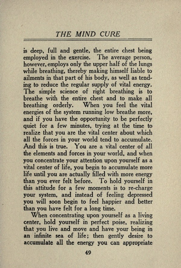 is deep, full and gentle, the entire chest being employed in the exercise. The average person, however, employs only the upper half of the lungs while breathing, thereby making himself liable to ailments in that part of his body, as well as tending to reduce the regular supply of vital energy. The simple science of right breathing is to breathe with the entire chest and to make all breathing orderly. When you feel the vital energies of the system running low breathe more, and if you have the opportunity to be perfectly quiet for a few minutes, trying at the time to realize that you are the vital center about which all the forces in your world tend to accumulate. And this is true. You are a vital center of all the elements and forces in your world, and when you concentrate your attention upon yourself as a vital center of life, you begin to accumulate more life until you are actually filled with more energy than you ever felt before. To hold yourself in this attitude for a few moments is to re-charge your system, and instead of feeling depressed you will soon begin to feel happier and better than you have felt for a long time.
