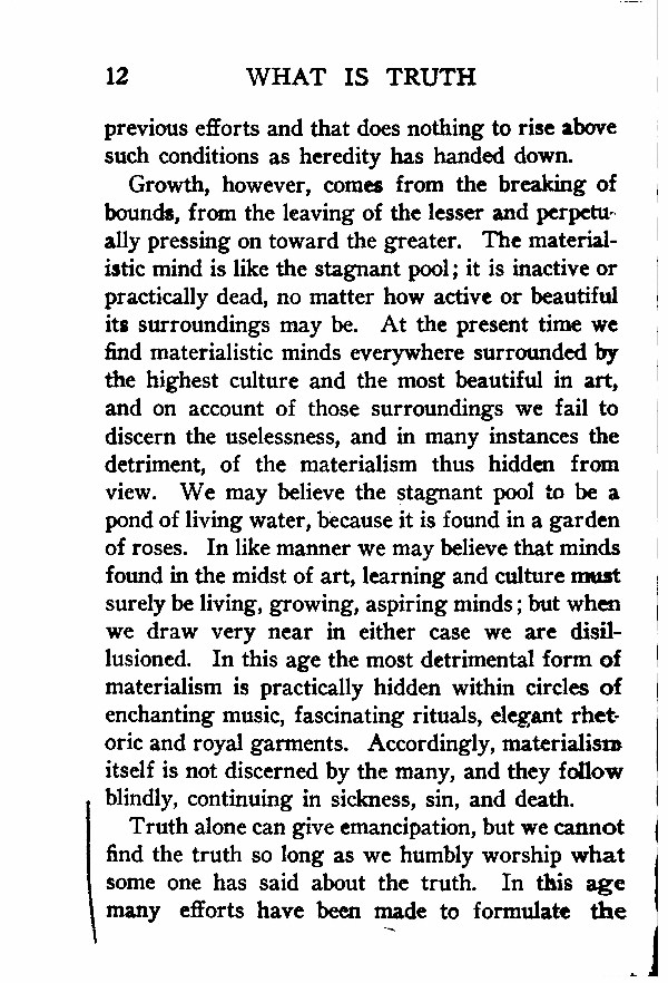 Growth, however, comes from the breaking of bounds, from the leaving of the lesser and perpetually pressing on toward the greater. The materialistic mind is like the stagnant pool; it is inactive or practically dead, no matter how active or beautiful its surroundings may be. At the present time we find materialistic minds everywhere surrounded by the highest culture and the most beautiful in art, and on account of those surroundings we fail to discern the uselessness, and in many instances the detriment, of the materialism thus hidden from view. We may believe the stagnant pool to be a pond of living water, because it is found in a garden of roses. In like manner we may believe that minds found in the midst of art, learning and culture must surely be living, growing, aspiring minds; but when we draw very near in either case we are disillusioned. In this age the most detrimental form of materialism is practically hidden within circles of enchanting music, fascinating rituals, elegant rhetoric and royal garments. Accordingly, materialism itself is not discerned by the many, and they follow blindly, continuing in sickness, sin, and death.