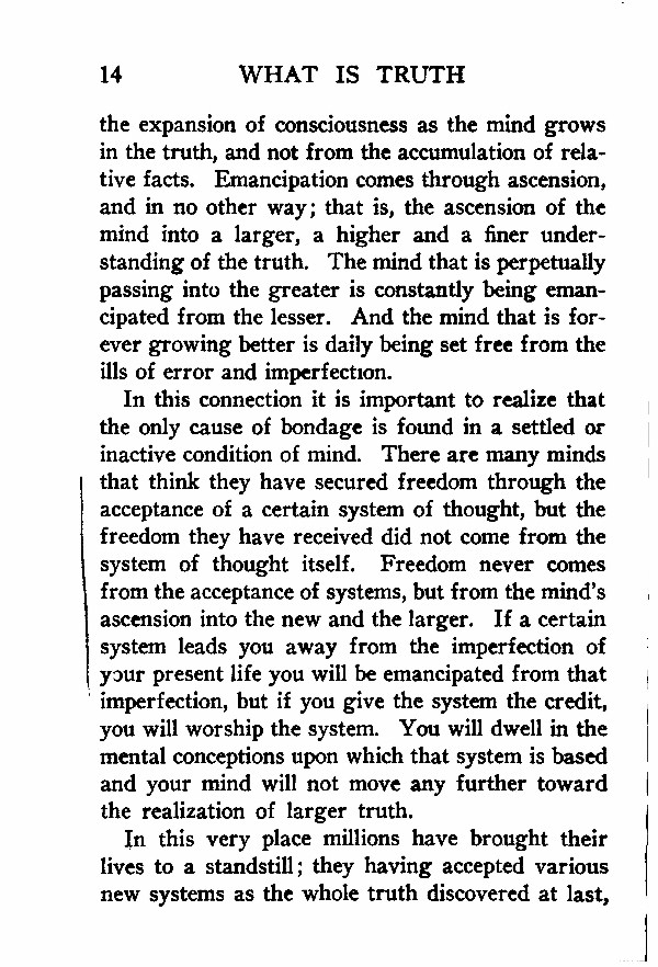In this connection it is important to realize that the only cause of bondage is found in a settled or inactive condition of mind. There are many minds that think they have secured freedom through the acceptance of a certain system of thought, but the freedom they have received did not come from the system of thought itself. Freedom never comes from the acceptance of systems, but from the mind's ascension into the new and the larger. If a certain system leads you away from the imperfection of your present life you will be emancipated from that imperfection, but if you give the system the credit, you will worship the system. You will dwell in the mental conceptions upon which that system is based and your mind will not move any further toward the realization of larger truth.
