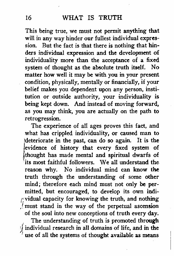 The experience of all ages proves this fact, and what has crippled individuality, or caused man to deteriorate in the past, can do so again. It is the evidence of history that every fixed system of |thought has made mental and spiritual dwarfs of 'its most faithful followers. We all understand the reason why. No individual mind can know the truth through the understanding of some other mind; therefore each mind must not only be permitted, but encouraged, to develop its own individual capacity for knowing the truth, and nothing must stand in the way of the perpetual ascension of the soul into new conceptions of truth every day. The understanding of truth is promoted through individual research in all domains of life, and in the use of all the systems of thought available as means