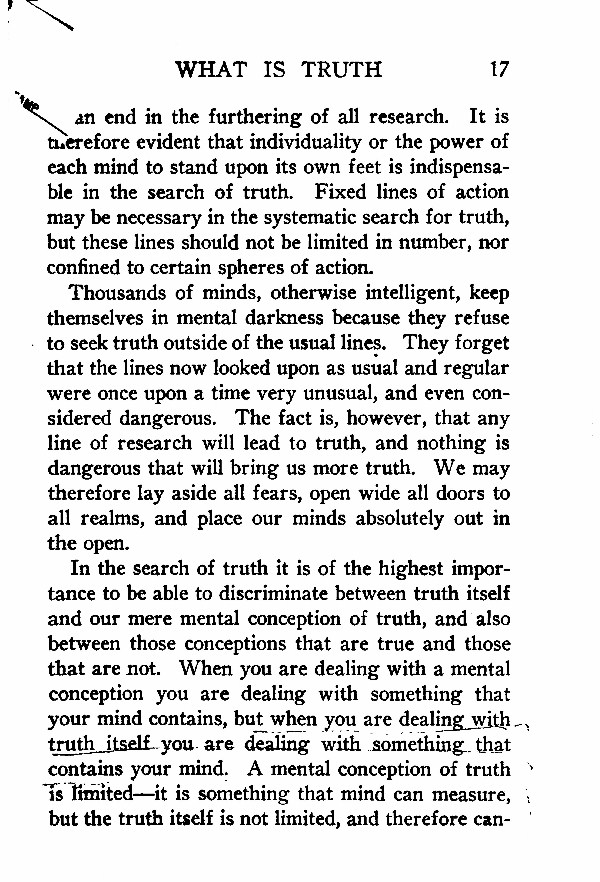 In the search of truth it is of the highest importance to be able to discriminate between truth itself and our mere mental conception of truth, and also between those conceptions that are true and those that are not. When you are dealing with a mental conception you are dealing with something that your mind contains, but^when you are dealing with truth itself you are dealing with something that contains your mind. A mental conception of truth is limited --- it is something that mind can measure, but the truth itself is not limited, and therefore cannot