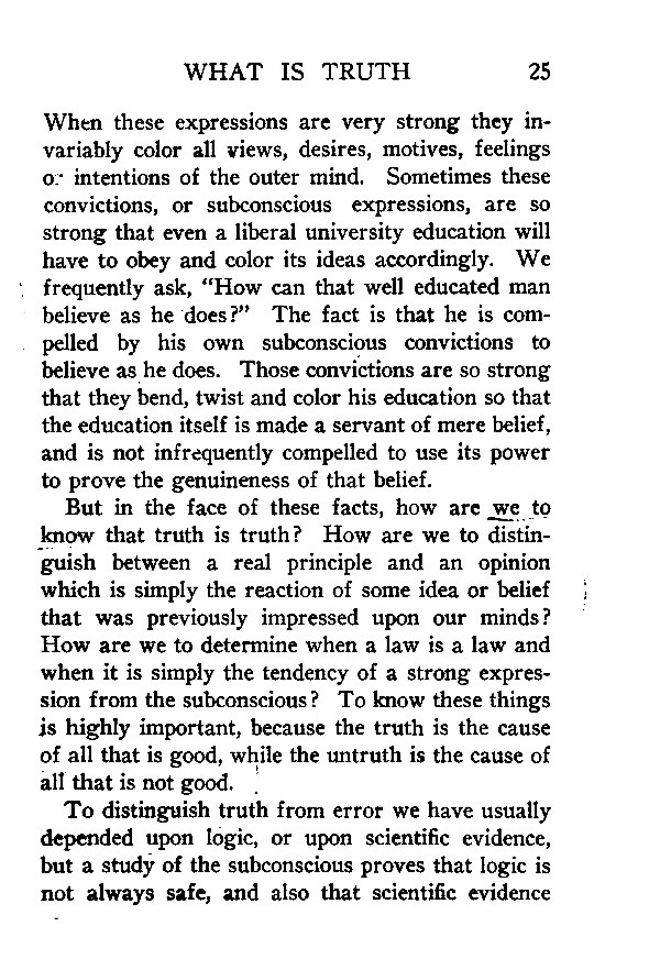 To distinguish truth from error we have usually depended upon logic, or upon scientific evidence, but a study of the subconscious proves that logic is not always safe, and also that scientific evidence