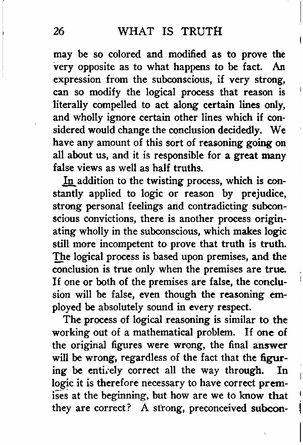 In addition to the twisting process, which is constantly applied to logic or reason by prejudice, strong personal feelings and contradicting subconscious convictions, there is another process originating wholly in the subconscious, which makes logic still more incompetent to prove that truth is truth. The logical process is based upon premises, and the conclusion is true only when the premises are true. If one or both of the premises are false, the conclusion will be false, even though the reasoning employed be absolutely sound in every respect.
