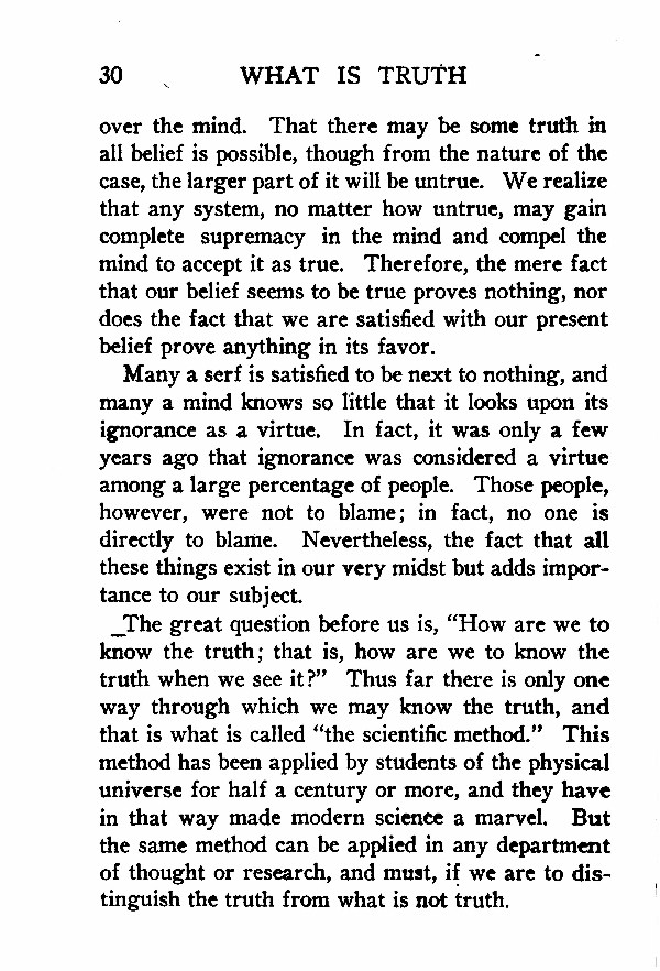 The great question before us is, "How are we to know the truth; that is, how are we to know the truth when we see it?" Thus far there is only one way through which we may know the truth, and that is what is called "the scientific method." This method has been applied by students of the physical universe for half a century or more, and they have in that way made modern science a marvel. But the same method can be applied in any department of thought or research, and must, if we are to distinguish the truth from what is not truth.