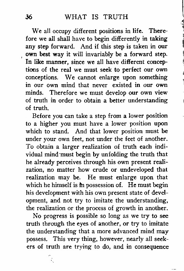 We all occupy different positions in life. Therefore we all shall have to begin differently in taking any step forward. And if this step is taken in our own best way it will invariably be a forward step. In like manner, since we all have different conceptions of the real we must seek to perfect our own conceptions. We cannot enlarge upon something in our own mind that never existed in our own minds. Therefore we must develop our own view of truth in order to obtain a better understanding of truth.