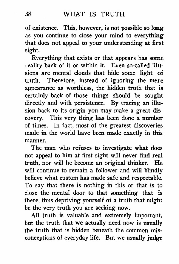 Everything that exists or that appears has some reality back of it or within it. Even so-called illusions are mental clouds that hide some light of truth. Therefore, instead of ignoring the mere appearance as worthless, the hidden truth that is certainly back of those things should be sought directly and with persistence. By tracing an illusion back to its origin you may make a great discovery. This very thing has been done a number of times. In fact, most of the greatest discoveries made in the world have been made exactly in this manner.