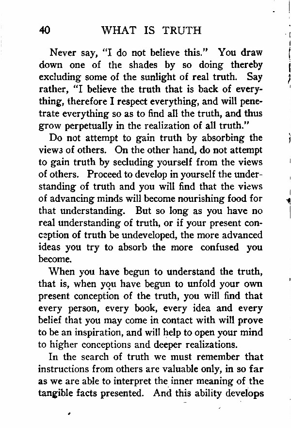 Never say, "I do not believe this." You draw down one of the shades by so doing thereby excluding some of the sunlight of real truth. Say rather, "I believe the truth that is back of everything, therefore I respect everything, and will penetrate everything so as to find all the truth, and thus grow perpetually in the realization of all truth."