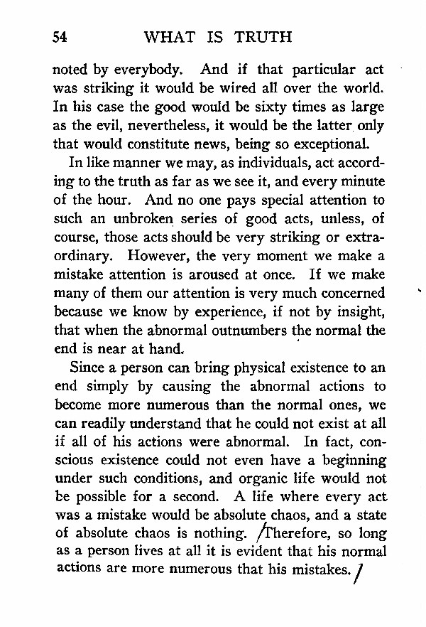 Since a person can bring physical existence to an end simply by causing the abnormal actions to become more numerous than the normal ones, we can readily understand that he could not exist at all if all of his actions were abnormal. In fact, conscious existence could not even have a beginning under such conditions, and organic life would not be possible for a second. A life where every act was a mistake would be absolute chaos, and a state of absolute chaos is nothing. Therefore, so long as a person lives at all it is evident that his normal actions are more numerous that his mistakes.