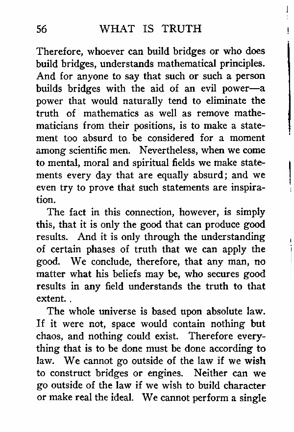 Therefore, whoever can build bridges or who does build bridges, understands mathematical principles. And for anyone to say that such or such a person builds bridges with the aid of an evil power --- a power that would naturally tend to eliminate the truth of mathematics as well as remove mathematicians from their positions, is to make a statement too absurd to be considered for a moment among scientific men. Nevertheless, when we come to mental, moral and spiritual fields we make statements every day that are equally absurd; and we even try to prove that such statements are inspiration.