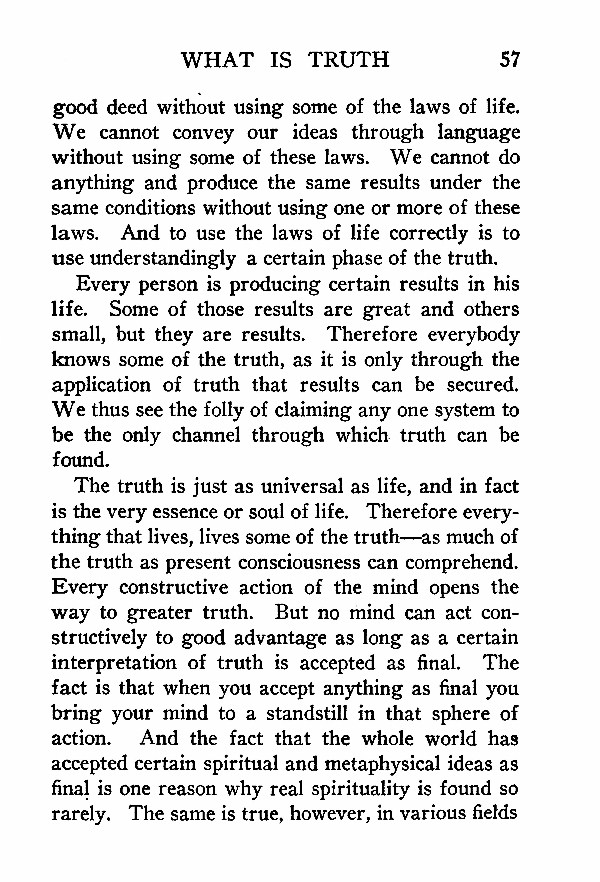 The truth is just as universal as life, and in fact is the very essence or soul of life. Therefore everything that lives, lives some of the truth --- as much of the truth as present consciousness can comprehend. Every constructive action of the mind opens the way to greater truth. But no mind can act constructively to good advantage as long as a certain interpretation of truth is accepted as final. The fact is that when you accept anything as final you bring your mind to a standstill in that sphere of action. And the fact that the whole world has accepted certain spiritual and metaphysical ideas as final is one reason why real spirituality is found so rarely. The same is true, however, in various fields