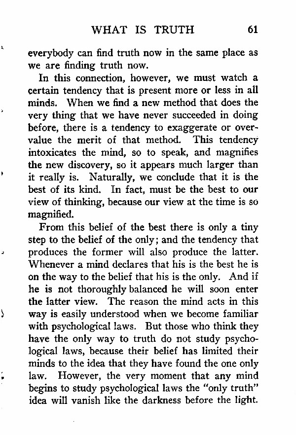 From this belief of the best there is only a tiny step to the belief of the only; and the tendency that produces the former will also produce the latter. Whenever a mind declares that his is the best he is on the way to the belief that his is the only. And if he is not thoroughly balanced he will soon enter the latter view. The reason the mind acts in this way is easily understood when we become familiar with psychological laws. But those who think they have the only way to truth do not study psychological laws, because their belief has limited their minds to the idea that they have found the one only law. However, the very moment that any mind begins to study psychological laws the "only truth" idea will vanish like the darkness before the light.